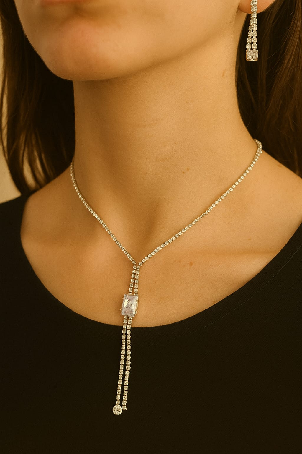 Işıltıyı ve şıklığı bir arada yaşayın! Parlayan zirkon taşlarla tasarlanmış bu lüks set, hem küpe hem kolye ile kombinlenerek özel anlarınızda göz alıcı bir görünüm sunar. Minimalist ama zarif detaylarıyla her kombine uyum sağlar.